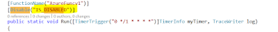 This method lets you enable and disable the function by changing the app setting, without recompiling or redeploying. Changing an app setting causes the function app to restart, so the disabled state change is recognized immediately.